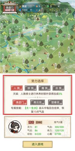 2、选择势力时,推荐选【清虚门】,其专属技能【大水】能在战斗中回血,适合新手快速适应游戏节奏。
