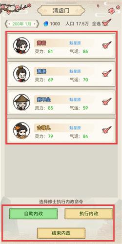 4、在修士管理界面,点击【执行内政】按钮,安排修士完成任务,能有效提升门派的各项资源收益。