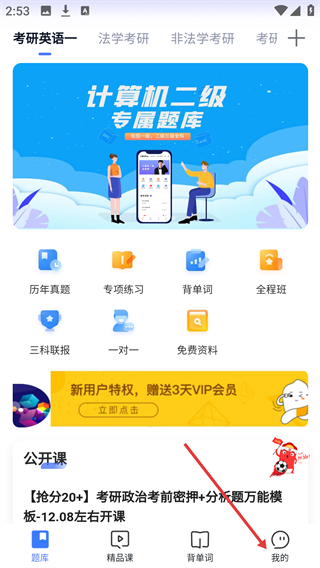 1、进入包含【历年真题】【专项练习】等功能的题库页面,找到底部的【我的】按钮并点击,可进入个人相关页面。