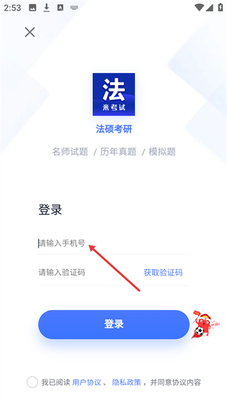 3、进入对应【法硕考研】内容的登录页面,需先在【请输入手机号】输入框中填写个人对应的手机号码。