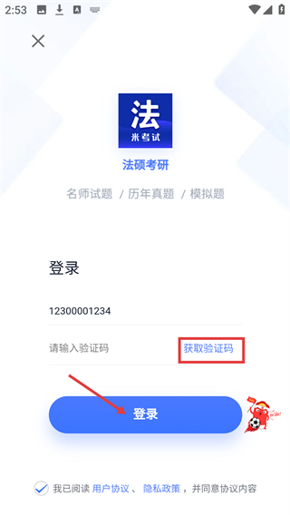 4、在登录页填写好手机号,勾选协议后点击【获取验证码】,后续可操作【登录】按钮完成登录。