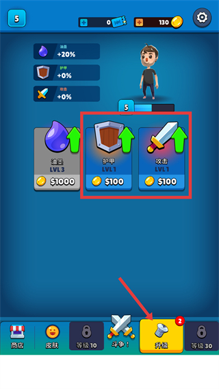 4、在主界面里,点击升级进入升级界面,消耗金币升级【护甲-1】【攻击-1】等属性,提升战车战力后继续挑战。