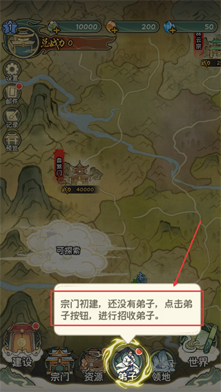 1、宗门初建无弟子,点击【弟子】按钮开启招收,这是壮大宗门的第一步,需优先完成。