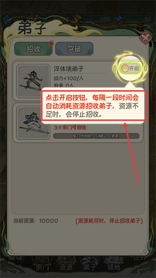 2、在【弟子】界面点击【开启】按钮,自动消耗资源招弟子,资源不足时会停止招收。
