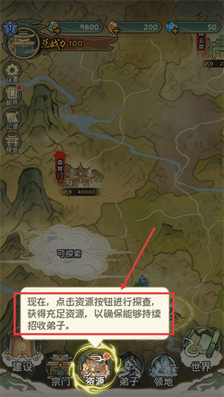 3、点击【资源】按钮探查资源点,获取足够资源以保障弟子招收不中断,维持宗门发展。