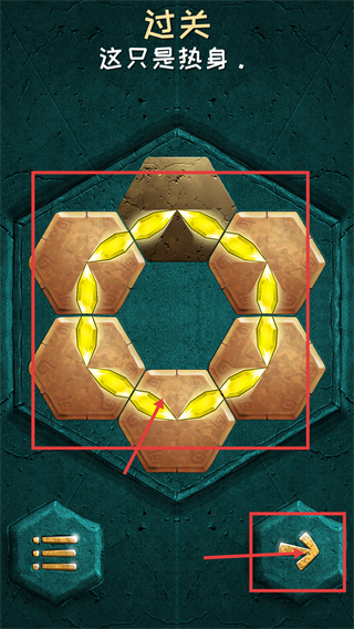 4、出现“过关”提示后,确认红色框选的拼图已完整衔接,点击对应前进按钮,推进至后续拼图关卡。