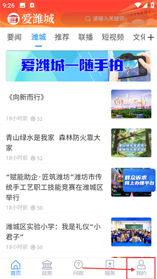 1、进入【爱潍城】软件后,点击底部【我的】入口,可进入个人功能页面,为后续操作做准备。