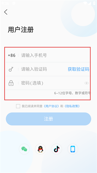 4、在【用户注册】页面,按提示填写【+86-请输入手机号】-获取【验证码】-设置【密码】,完成注册。