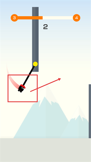3、继续操控红色框选的角色摆动,借助绳索惯性荡向目标区域,当前关卡进度更新至【2】,靠近通关条件。