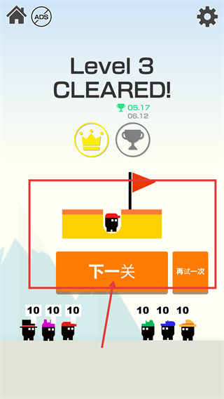 4、达成【Level-3 CLEARED!】后,点击红色框选的【下一关】按钮,开启后续的摆动挑战关卡,本次关卡成功通关。