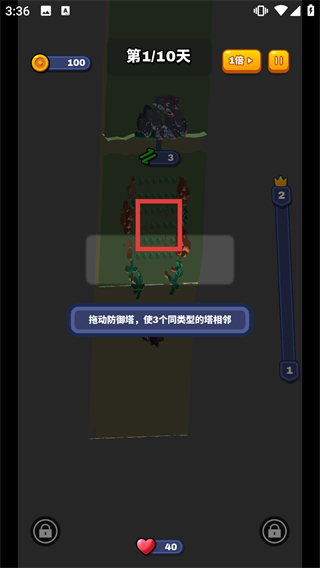 2、进入关卡后,按照提示拖动【防御塔】,使3个同类型的防御塔处于相邻位置,为后续合并做准备。