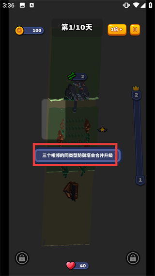 3、当3个相邻的同类型【防御塔】满足条件时,会自动合并并升级,以此提升防御塔的战斗能力。