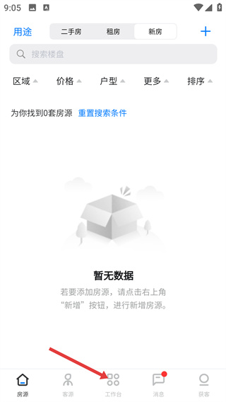 1、在房源页面,点击底部的【工作台】按钮,可切换至工作台界面,使用更多业务功能。