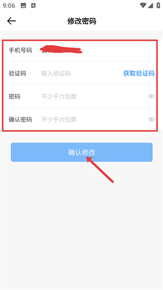 4、在修改密码页面,填写手机号、获取并输入验证码、设置新密码后,点击【确认修改】完成密码更新。