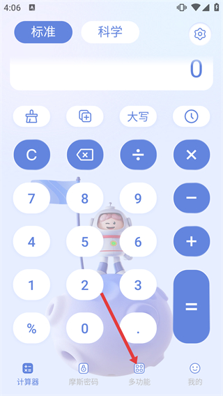1、在计算器主界面,点击底部导航栏的【多功能】选项,切换至多功能工具集合页面,可查看各类实用计算工具。