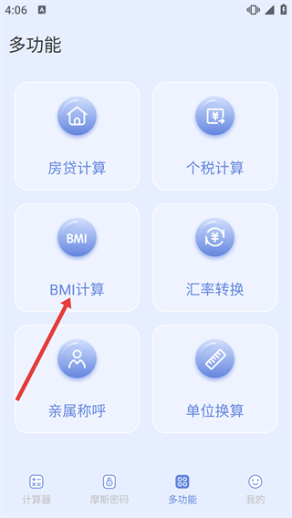 2、在多功能页面中,选择【BMI计算】选项,进入BMI指数的专属计算界面,准备录入身体数据。