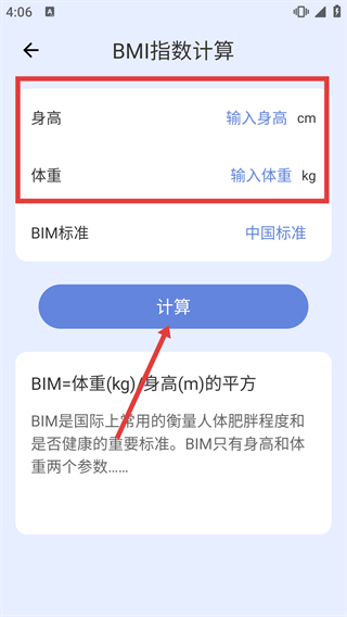 3、在BMI指数计算页面,分别在【身高】、【体重】输入框中填写对应数值,完成数据录入。