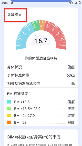 4、填写完身高与体重后,点击【计算】按钮,即可获取BMI计算结果,包括体型评估、标准体重及健康风险等信息。