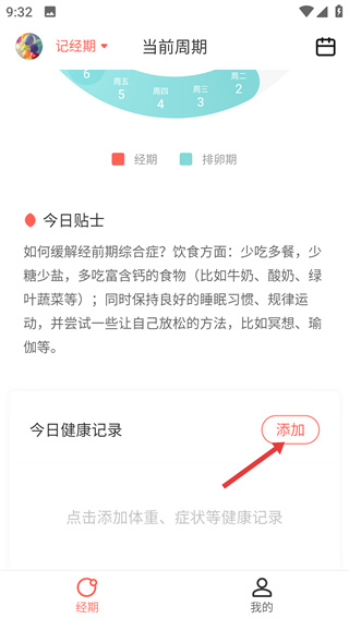 1、在记经期页面,点击【今日健康记录】旁的【添加】按钮,可进入健康记录填写界面,记录身体相关数据。