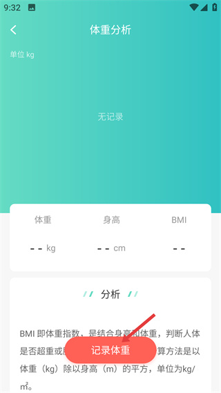 3、进入体重分析页面,点击【记录体重】按钮,可启动体重信息的记录流程。