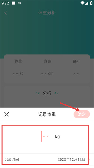 4、在记录体重弹窗中,填写体重数值并确认记录时间后,点击【确定】按钮完成体重记录操作。