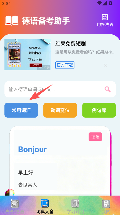 1、提供语言切换功能,点击切换按钮,在德语与法语之间切换学习语种。