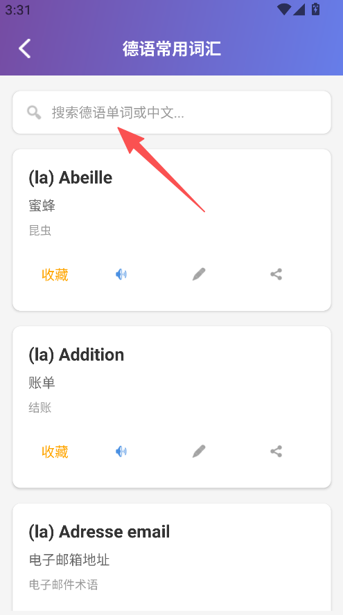 2、词汇展示包含释义类别,搭配收藏发音功能,适配词汇积累与听读练习场景。