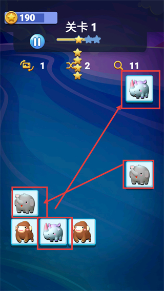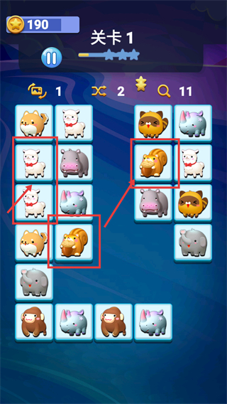 3、继续在【关卡1】中,点击红色框选的相同宠物(如犀牛、兔子)配对,消除进度更新,靠近关卡目标。