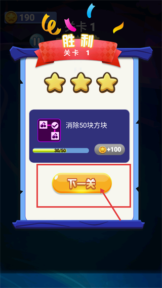 4、达成【关卡1-胜利】后,看到消除进度【30/50】及奖励【+100】,点击红色框选的【下一关】按钮,开启后续关卡。
