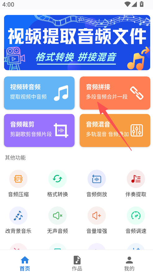 1、提供音频拼接功能,点击对应板块,选择目标音频并确定进入音频拼接页面。
