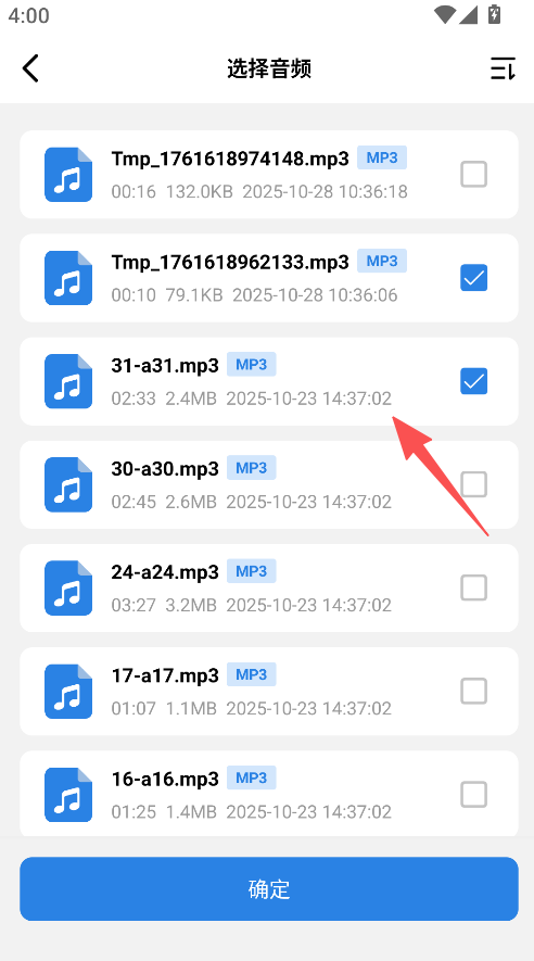 2、在选择音频页,选定目标音频后点击确定。