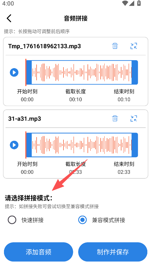 3、提供多拼接模式选择,含快速及兼容模式,适配不同音频拼接的需求。