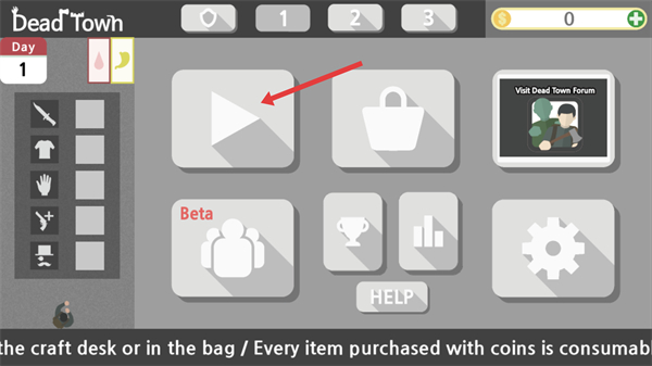 1、在主界面点击播放按钮,进入【Day-1】关卡,开启僵尸生存挑战,准备收集资源。