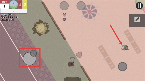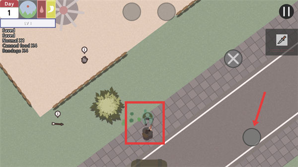 3、靠近僵尸后,点击箭头所指【按钮】操控角色进行攻击消灭僵尸。