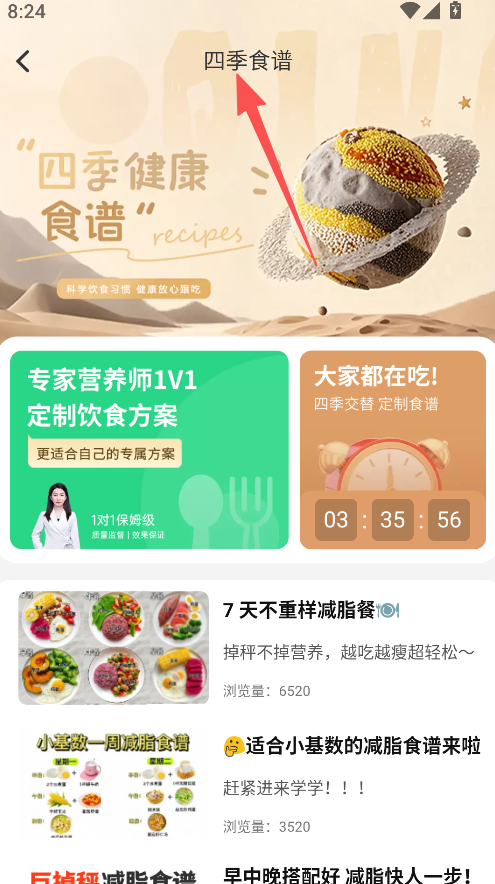 1、聚焦健康饮食设四季食谱核心板块,含专家1V1定制方案,覆盖四季交替的饮食需求,适配健康减脂的饮食规划场景。