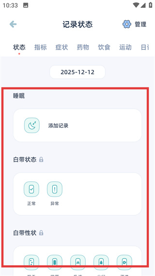 3、在记录状态页面,还能操作【睡眠】的添加记录,选择【白带状态】的正常/异常等信息,完善经期相关数据。