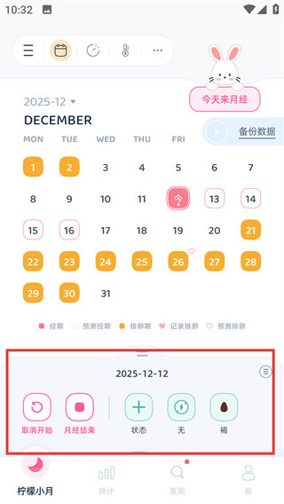 4、完成状态记录后,日历页面会更新经期标识,可通过底部的【取消开始】、【月经结束】等按钮管理经期状态。