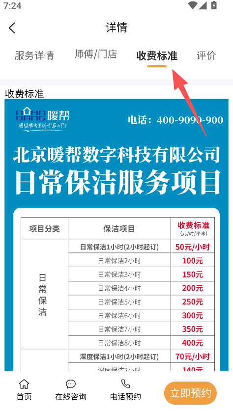 3、提供服务预约功能,在服务详情页,通过在线咨询电话预约或立即预约完成服务的预订操作。