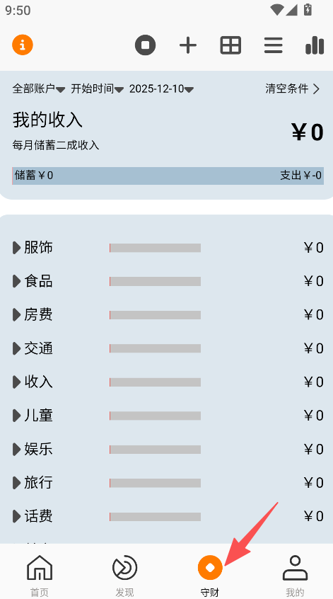 1、具备收支分类查看功能,进入守财板块,查看服饰食品等多类收支的统计及金额情况。