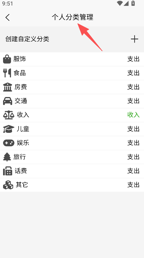 2、设有分类管理功能,进入个人分类管理页面,创建自定义分类调整收支分类的体系。