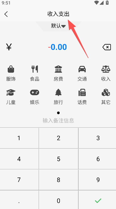 3、选择收入支出分类,输入金额后完成记录。