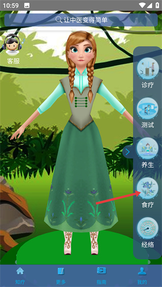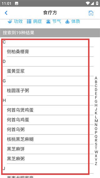 1、在主界面点击右侧的【食疗】选项,进入食疗方页面,该页面可查询食疗方、食材等相关内容。