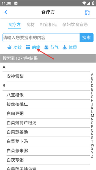 2、进入食疗方页面后,点击【病症】分类标签,切换至病症维度的食疗方案列表,便于按病症筛选。
