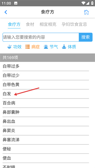 3、在病症分类的列表中选择【白发】选项,系统会筛选出针对该病症的食疗方内容,精准匹配需求。