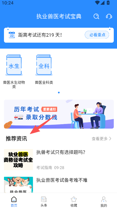 《执业兽医考试宝典》是一款执业兽医考试辅助类软件。显示考试倒计时(距考试 219 天),分水生(兽医水生生物类)、全科(兽医全科类)板块,展示历年考试录取分数线,设推荐资讯板块,头条分行业聚焦、考试指南、考试动态,点击资讯可查看考试题型分类等详情,适配执业兽医考试的信息获取、备考辅助需求。