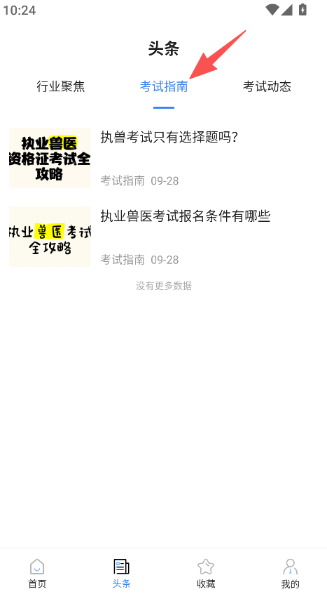 2、设有头条分类功能,在头条页选择考试指南分类,查看对应的考试相关资讯列表。