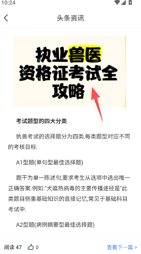 1、具备考试分类浏览功能,进入对应板块,查看水生或全科类别的执业兽医考试相关内容。
