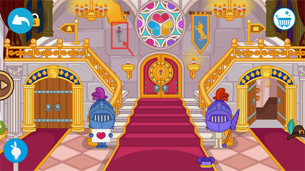 3、在城堡场景中,点击红色框选的钥匙区域,获取开门道具,为后续打开主门的探索任务做准备。