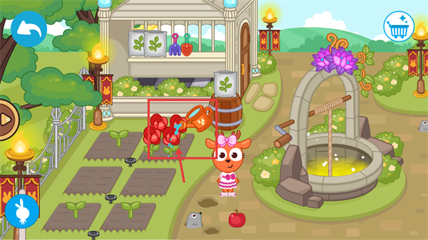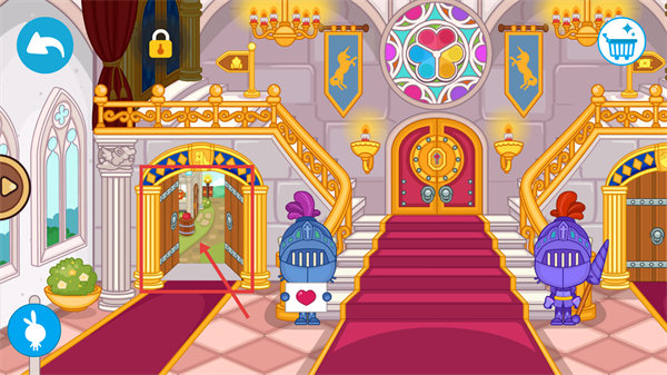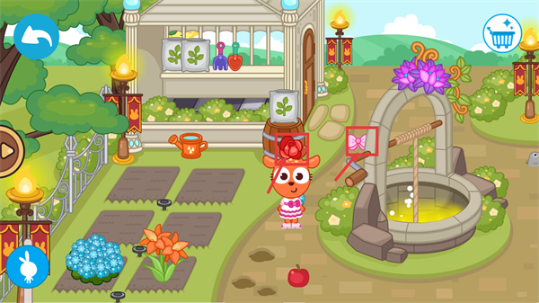 1、在城堡场景中,点击红色框选的门区域,进入花园主题互动场景,开启本次花园种植的探索任务。