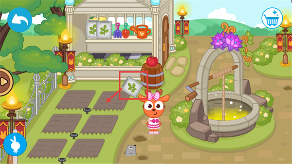 2、进入花园场景后,点击红色框选的种子道具,获取种植材料,为后续的花卉种植互动做准备。